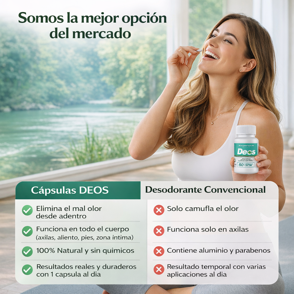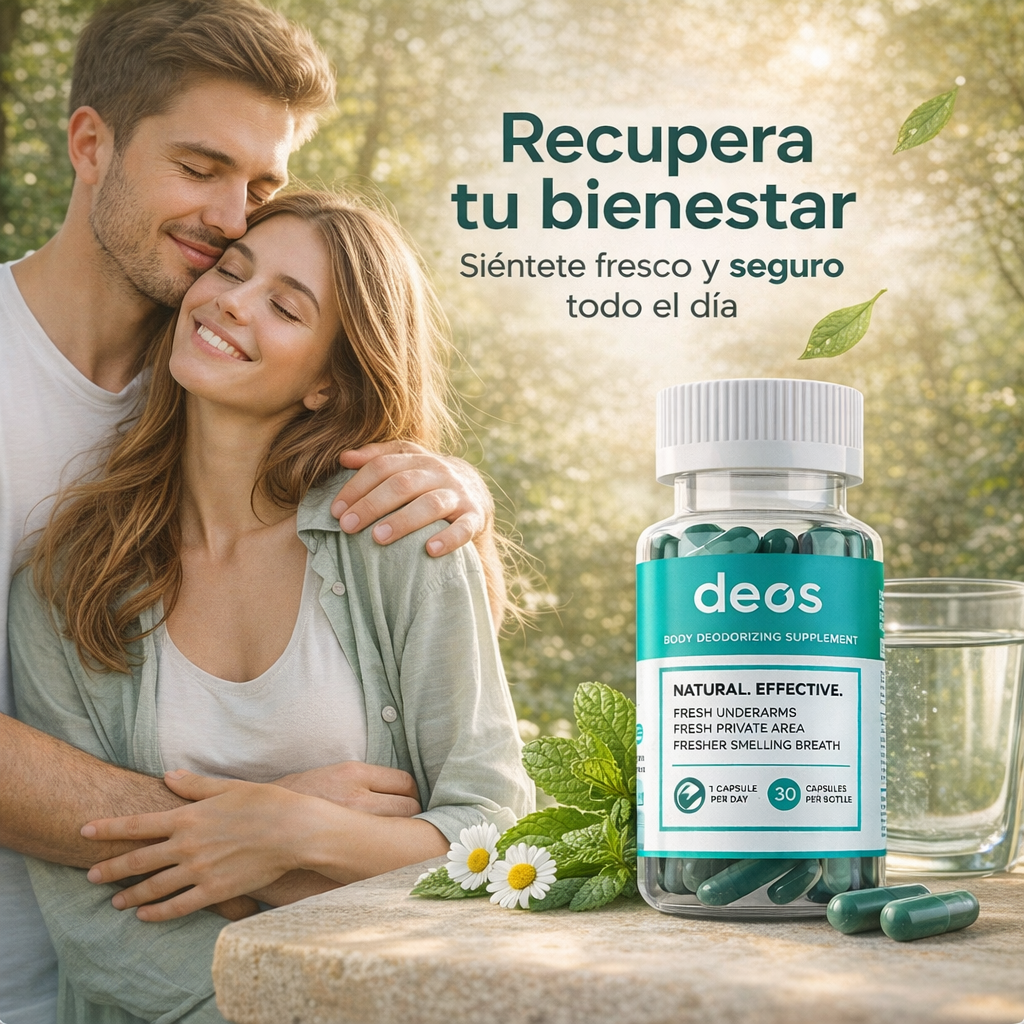 DEOS es un suplemento en cápsulas que ayuda a neutralizar el mal olor corporal y el mal aliento desde el interior. Ideal para quienes sudan mucho, entrenan fuerte o simplemente quieren sentirse frescos 24/7 sin químicos, sin aluminio y sin complicaciones. Presentación: 30 cápsulas.
